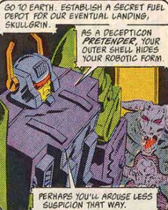 Transformers (Marvel) #45 Call it, "Spotlight: Skullgrin" More than any other Decepticon Pretender, Skullgrin is featured exclusively in this issue, when he is sent to Earth by Scorponok to set up a "secret fuel depot." It's the comic equivalent to the G1 cartoon, "Hoist goes to Hollywood." Here Skullgrin is protrayed as a villain with virtue.